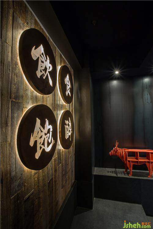 入口处以公牛艺术装置和光晕招牌首先展示目的,踱步至主入口由玻璃砖墙和白色瓷砖墙围合而成的展示墙,两个金色的品牌标识彼此相对,清楚地告知客户店铺由两个不同的品牌集合而成。餐厅设计