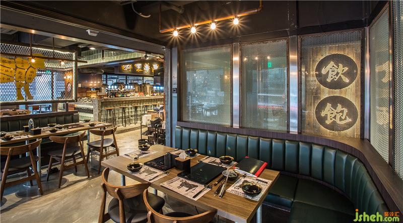 开放式设计打造主用餐区,利用卡座固定部分座位,再搭配可移动座位,整体达到高效灵活。空间中吊灯和家具的选择均采用质朴的金属、锌水管、木材和皮革定制,近天花处围合一圈玻璃砖,在灯光的照射下发出迷离的光环,融合实际的工业氛围更贴合顾客需求,让用餐成为享受。餐厅设计