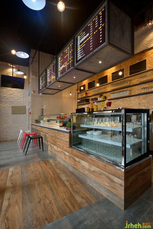 本案例的材料基本上以奥松板、红砖做旧、钢材、水泥板、硅酸钙板、玻璃、乳胶漆和仿木地砖、水泥地砖等等来运用来打造。首先,室内设计师在门头运用了水泥板作为基调配上白色的LED照明的Loog,每当夜晚降临时刻门头便发出耀眼的光芒,时刻提醒着人们它的品牌功能。服务台位于地中央以钢结构为基础表面是仿木地砖饰面,台面运用白色石英石和玻璃相结合,给人以卫生、安全之感。服务台上面的灯箱是钢结构骨架加上水泥板材质给人一种强烈的工业风,灯箱运用LED灯管照明,节能环保是设计的主题,最大限度减少业主的运营成本。服务台后面的背景是以奥松板为主体配上钢结构,使之与砖墙、服务台相对应进行强烈的对比。白色的砖墙木色的背景、钢筋混凝土的原始结构、水泥地砖之间的色彩上、材质上之间互相穿插,形成了强烈的对比构成了现代气息非常浓烈的工业风格的归本主义。这一做法重新定义了原始建筑结构和工业文化的含义,使工业建筑物不再是丑陋的废墟,而是如梦如幻的风景来供人们欣赏。使得顾客来此地消费仿佛置身于一个美丽的新世界,争强了顾客与室内空间的互动感。