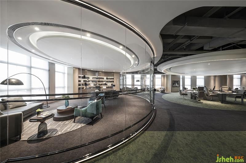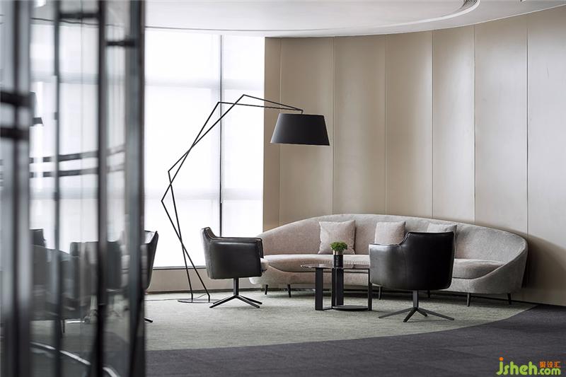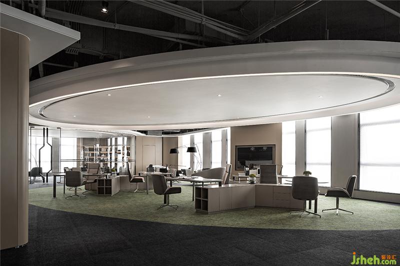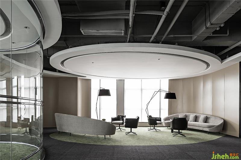 顺着地毯大曲线勾勒出的人流动线,观者会发现,整个空间给人的感觉像流动的圣洁。一个个自成空间的椭圆体,顺应建筑的弧形,将开放空间有规律地围合出不同的内部分区。这些分区或围着通透的大弧度落地玻璃,或完全敞开,仅以地面地毯的曲线作为空间的虚拟边界。从天面错落有致的白色吊顶动线,到弧形的玻璃墙面,再到地面地毯铺装出的曲线,启承转合,在动静之间恰到好处地给予了空间一种「行云流水」般的流动感和纯粹明达的气场。办公室设计