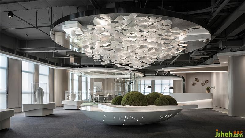 走进空间,驻足于接待区域前,第一眼映入眼帘的便是那上空洁白的装饰灯,似缤纷花瓣正徐徐飘落于清幽的山谷之上。上下两个椭圆形,一灰一白,天地呼应,互为依托,自成芳华。办公室设计