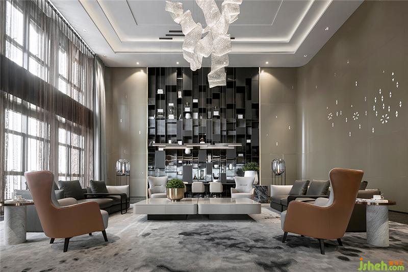 顶部闪耀的银色缎带,墙面晶莹的繁花,地面淡彩水墨晕染的地毯,窗边的一缕青纱帘,花器上的一抹绿色,于庄重之中,赋予了空间温润、雅致的格调。大理石如水墨一般流动的纹理色调与淡雅的地毯相呼应,搭配细腻的木饰面长方桌,让空间变得更加精致和有层次感。