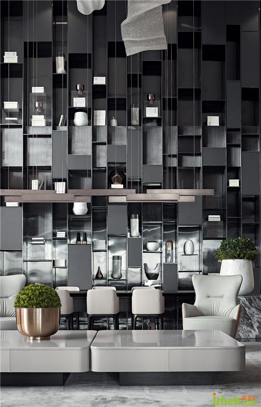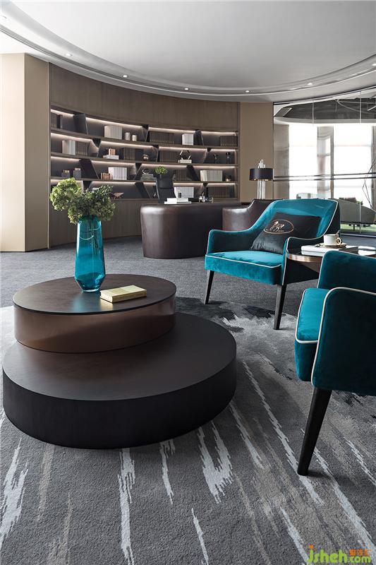 相对而言,贵宾接待区要符合贵宾的身份地位,除了墙面延续了弧形围合之外,沙发、茶几、装饰柜与其他物件以方正的秩序陈设,背景处顶天立地的黑色金属层架错落有致地摆放着书籍及简约的器皿艺术品,彰显庄重、大气与沉稳。办公室设计