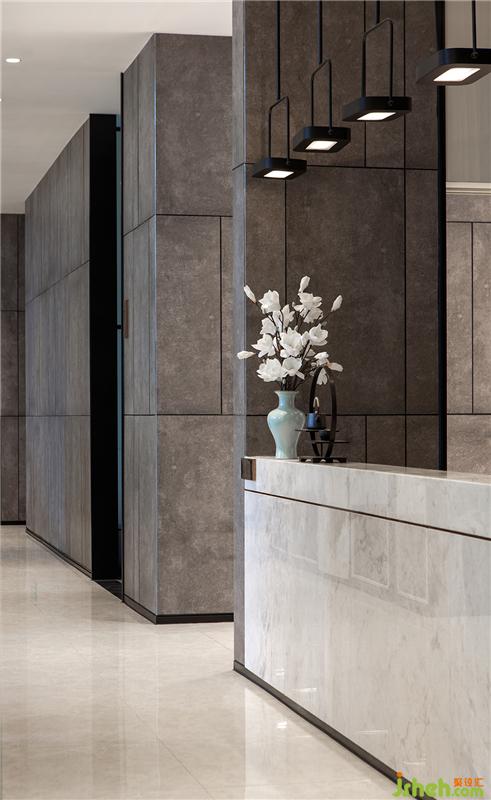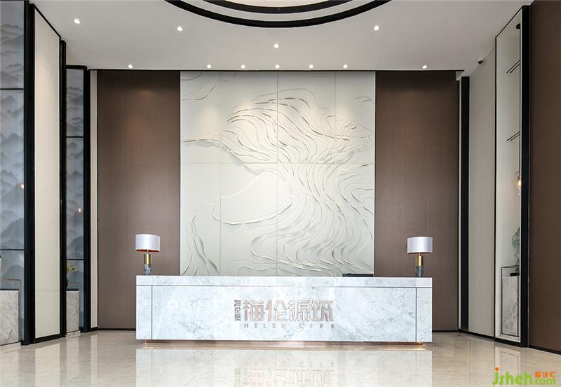 接待区背景墙是一面巨幅艺术浮雕,不规则的线条肌理抽象地呈现出梯形山野田园的意象。雅铂白大理石,有着山水云雾般的纹理,白润如玉的色泽,给观者以优雅稳重、柔和舒适的视觉感。装修设计