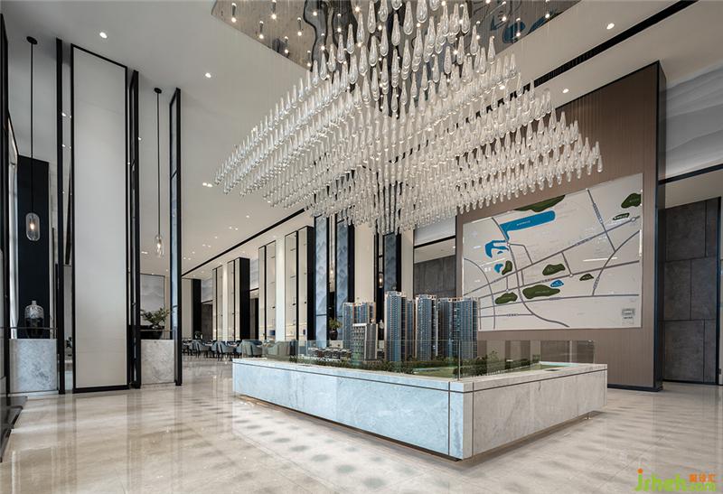 在沙盘展示区的上空,清光透亮的水滴型艺术玻璃吊饰灯,与贯穿整个空间的山峦水墨画相互映衬,宛若一场酣畅淋漓的山雨,洗尽浮世铅华,涤荡心灵尘垢。驻足于此,浮想雨后的山林,树叶苍翠无比,绿草鲜嫩欲滴,漫山素白的玉兰花,像圣洁的精灵,经过山雨的洗礼,变得更加莹洁高雅,空气中夹杂着泥土和花草的清香,心情亦变得舒畅开来……装修设计