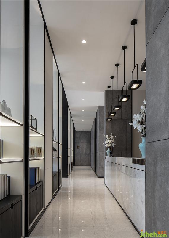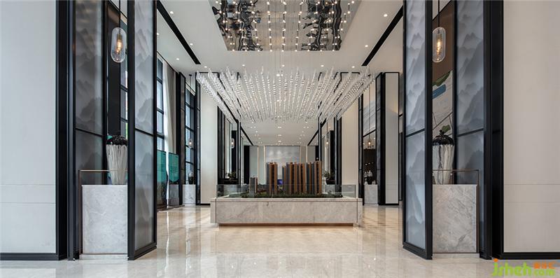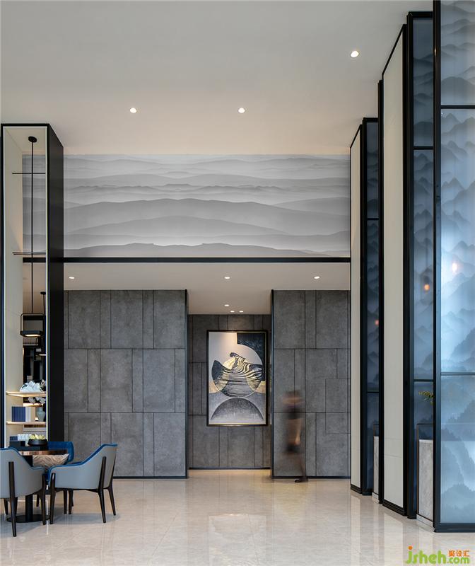 设计师以「山」为主题概念进行设计,延伸出山野田园、水墨山峦、雨落山城、过雨荷花等设计元素,将万亩山林的意象贯穿整个空间,让空间呈现出山峦叠嶂、群山起伏延绵数百里的意境,以现代写意的方式诠释「都市里的山居生活」。空间的色调以柔和的白色搭配高级的黑色为主,营造洁净无瑕、一尘不染的高雅环境。