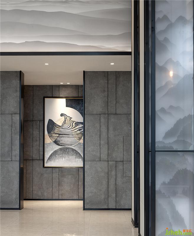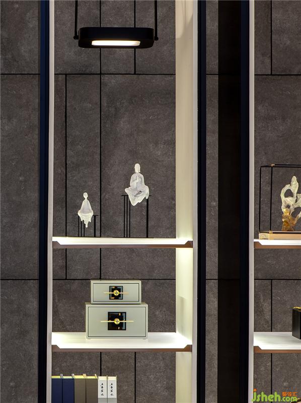 现代黑白的柱柜隔断,以阵列的形式布局,凸显空间井然有序的秩序感。柱柜是镂空式的,下方放置储物柜,中间设计了隔层,用于艺术品的摆放。隔层里面暗藏灯带,磨砂质感的白色,在皎洁灯光的映射下,白得更加纯粹。黑与白形成强烈的对比关系,勾勒出细致极简、自然优雅的视觉效果。镂空的设计,隔而不断,虚实结合,光线可以从中穿过,带来极强的空间通透感。装修设计