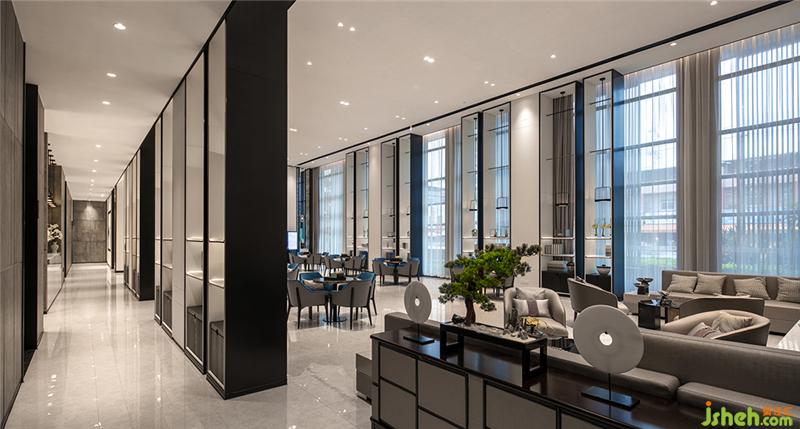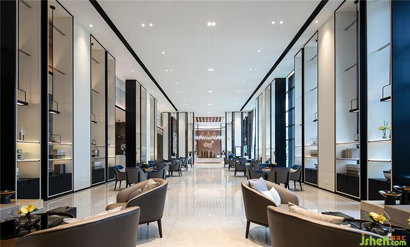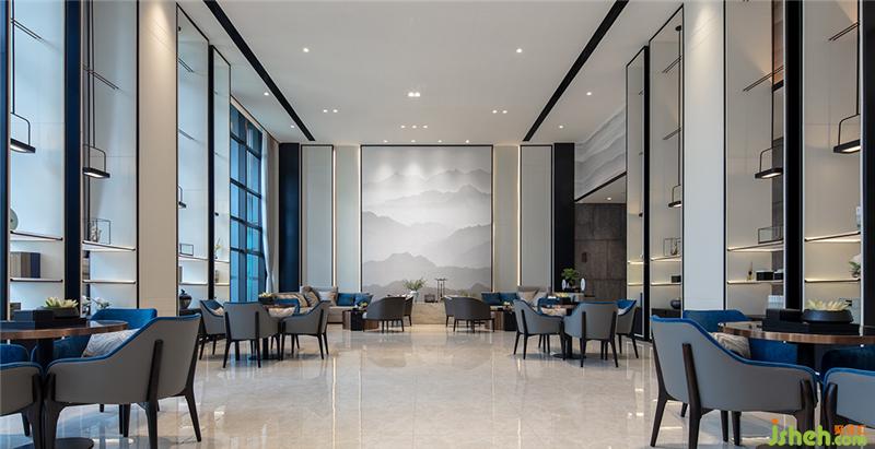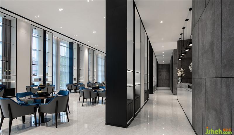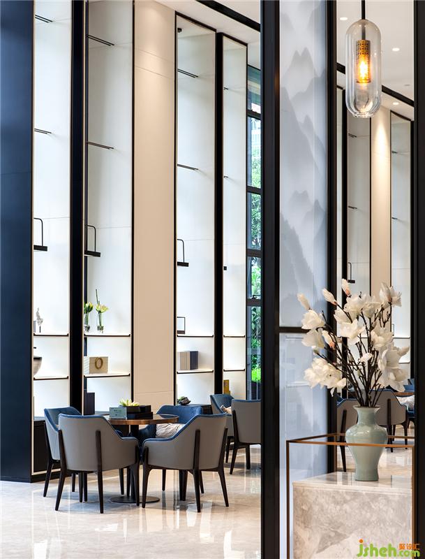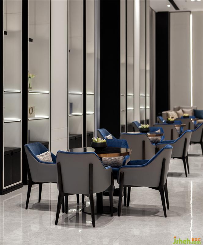 洽谈区湖蓝色的座椅将冰清玉洁的绿白色荷花围合其中,如潼湖的月色荷塘,优雅地演绎着「一座城市的山居故事」。