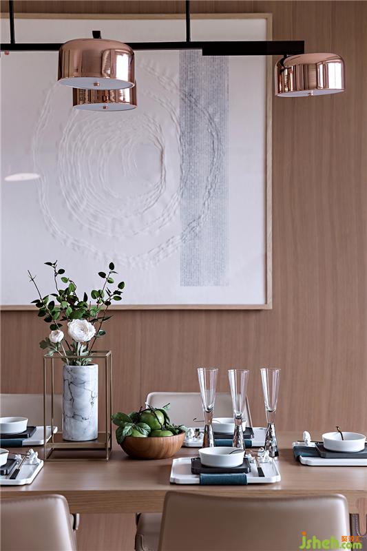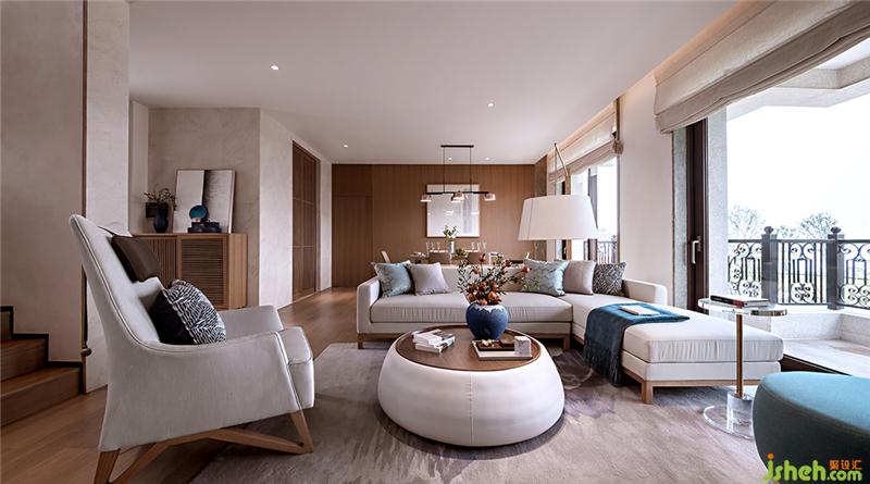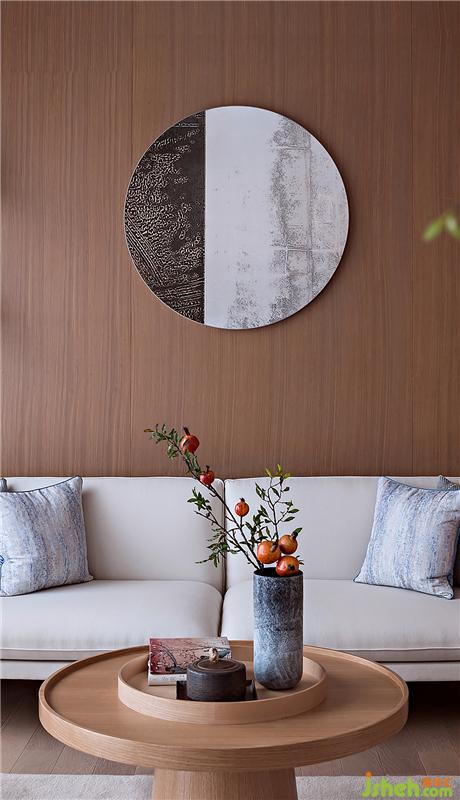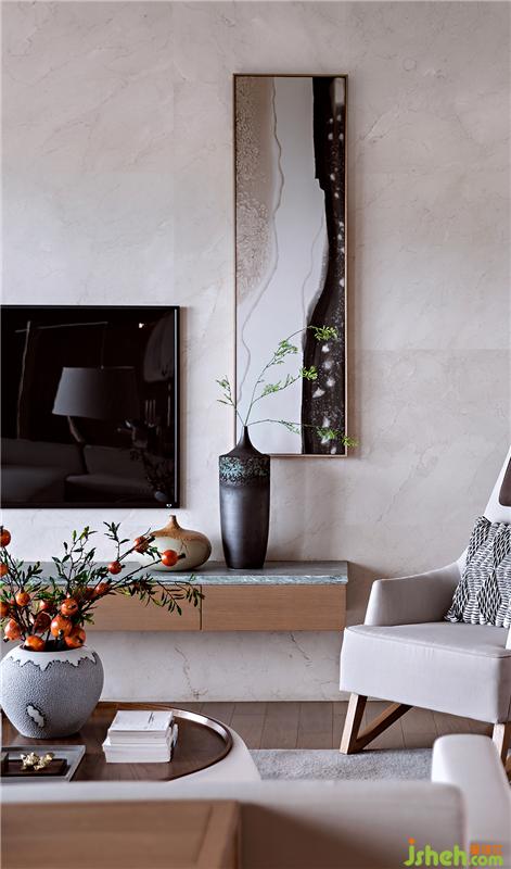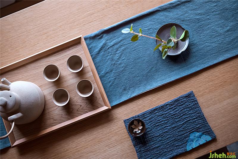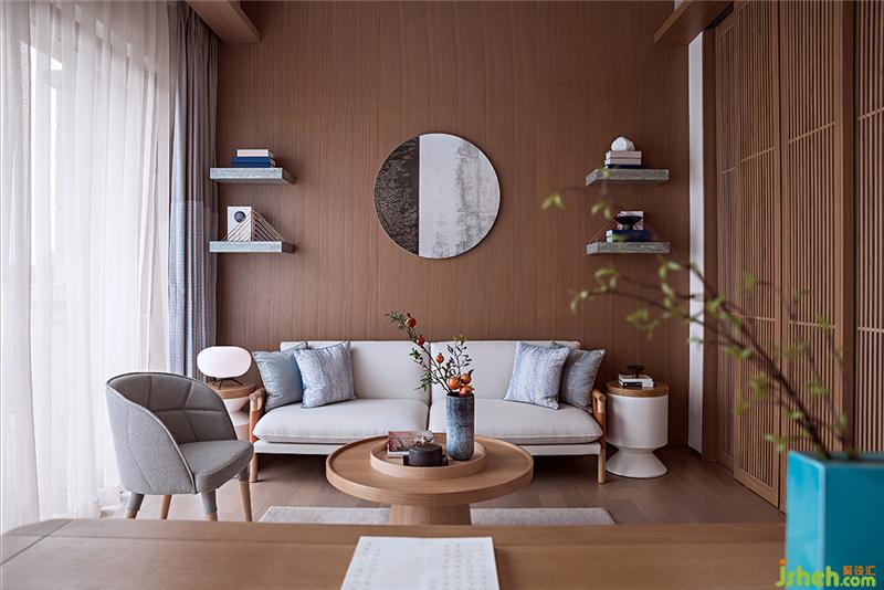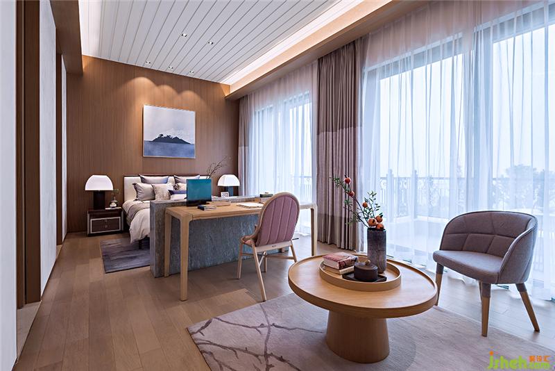 窗外的庭院将三楼主人房相拥与自然之间,房间延续原木素雅的基调与陈设品自然和谐的保持着某种平衡,重新解读物料的本质,演绎再造自然。休闲区与床之间设立了一桌案台,适当的划分了空间的尺度,似离而合的延续了风格脉络。样板房设计