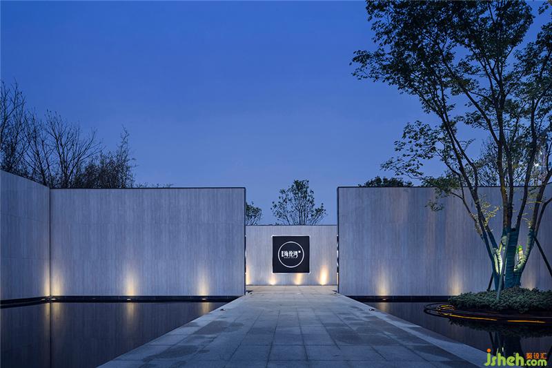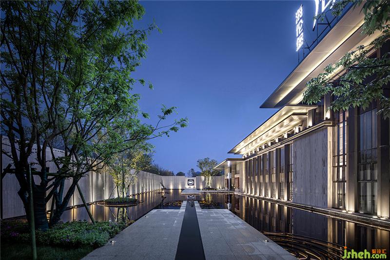 过雨园林,绿渐浓。当人们绕过影壁走进这一湾山水之中,眼前具有东方韵味的特色景墙与水景中的现代石路遥相呼应,在灯光隔带的映衬下,景墙、建筑、石路、绿树等实景在水中形成梦幻缥缈的倒影,一幅雅致秀逸、静穆纯粹而又富有时代风尚的新中式园林画卷跃然而生。