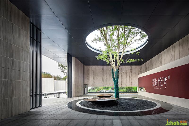 入口景观区中央,立于「水」中的一颗树,由内向外生长,连接天地,焕发勃勃生机,成了人与自然交流对话的一扇窗。此处采用了东方侘寂美学的枯山水造景手法,以石为山,以砂代水,象征山峦与湖海,现代抽象的艺术表现形式如一幅留白的写意山水画,给人们留出无限遐想的空间。会所设计