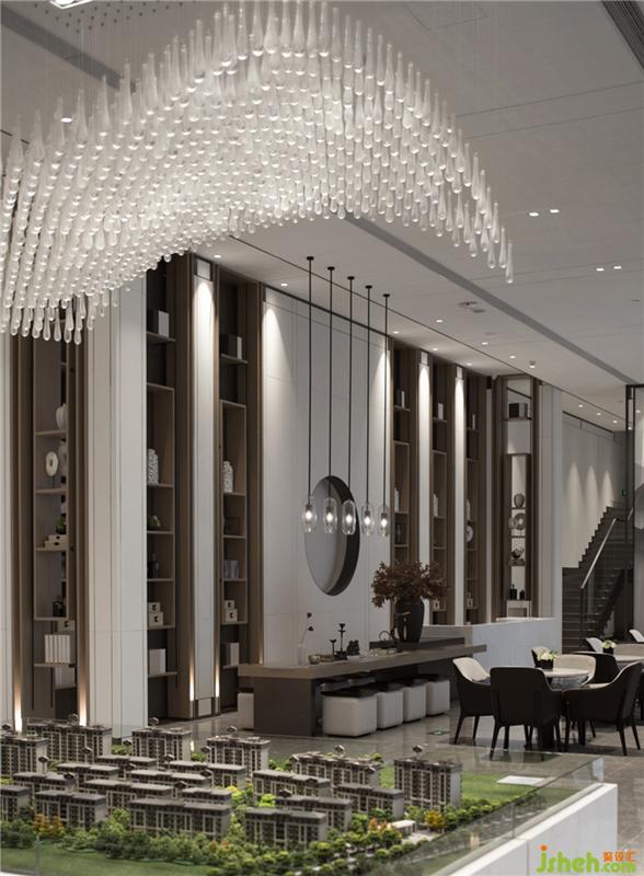 在空间关系的处理上,设计以简明的线条勾勒空间的层次,打造自然与建筑和谐共生。通过重构艺术的手法,运用点、线、面的构成,对不同空间进行分切和组合,实现时空再造,情景再现。主要亮点体现在沙盘区上空的水晶装饰灯,像一颗颗晶莹剔透的雨滴错落有序地排成一片,仿佛一场春雨裹挟着芳草的香气淅淅沥沥从天而降,滋润了整座城。
