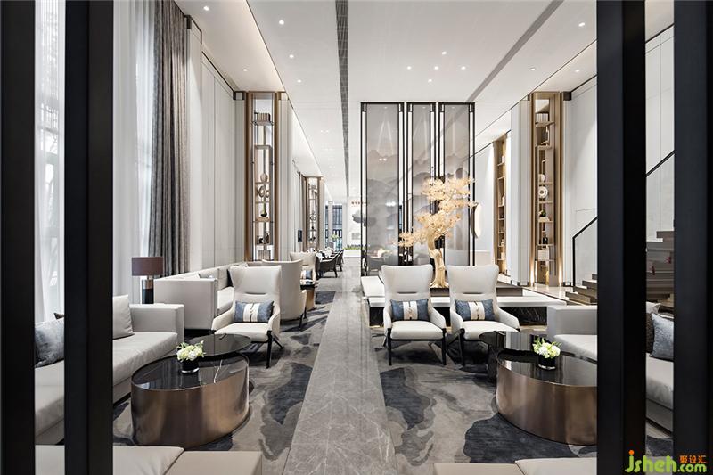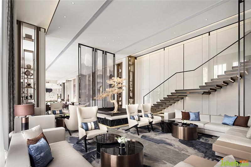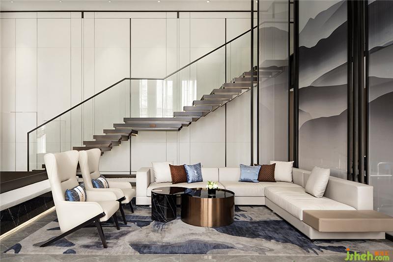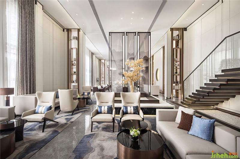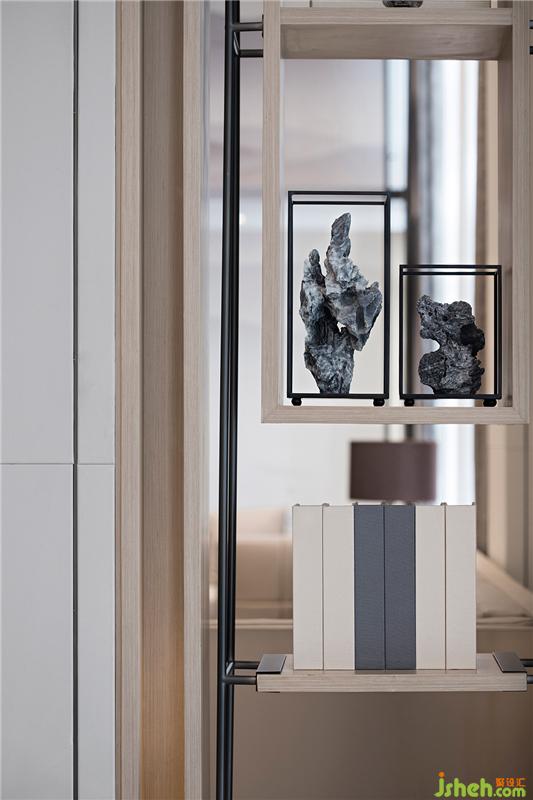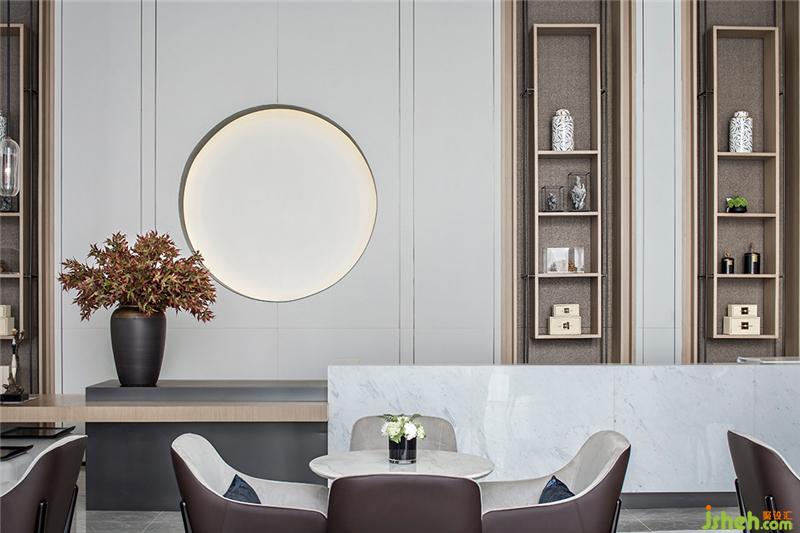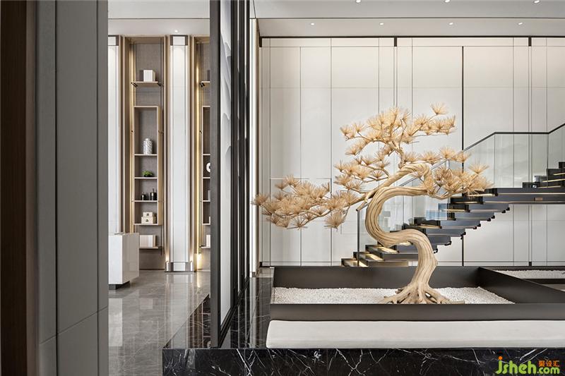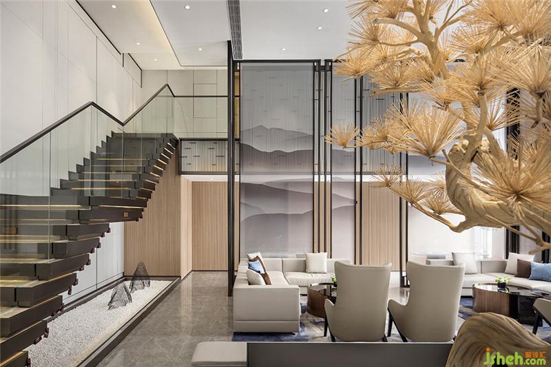 在VIP洽谈区,围合式山水屏风造景区和楼梯下的造景区,同样采用了枯山水的造景手法,以近于「空无」的枯淡静寂,呼应室外风景,给室内增添一丝诗意的趣味。会所设计