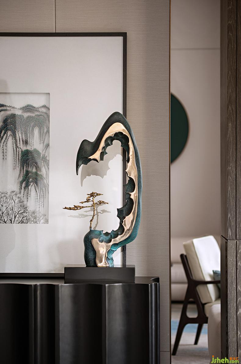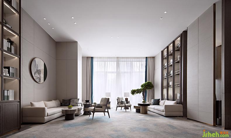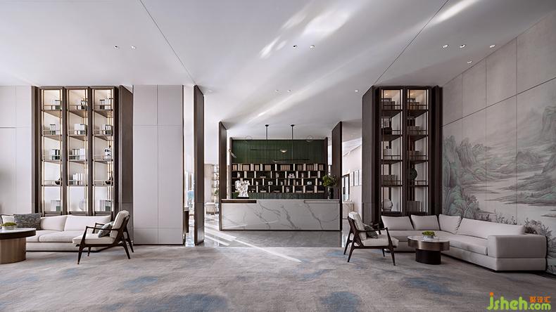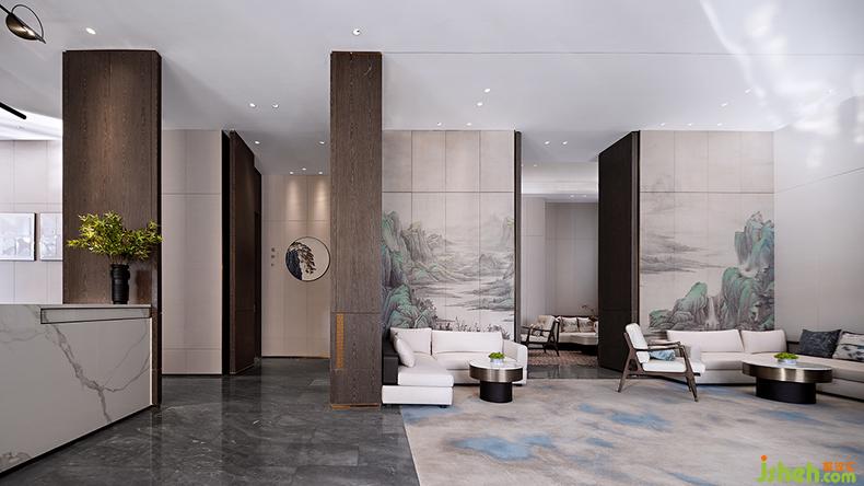 洽谈区延续了营销中心静逸儒雅的风格,销售中心设计空间的色彩搭配溯源中国古代的山水画,远山如黛,江水澄蓝,大面积的留白如同画布,靛青黛蓝描摹出清秀淡雅、超凡脱俗的意境。中国传统配色结合现代极简的表现手法,让空间整体呈现出东方美学独有的风韵。