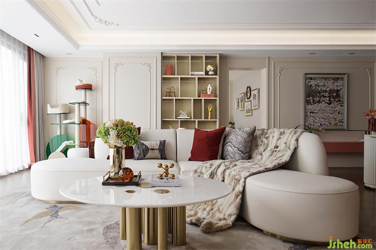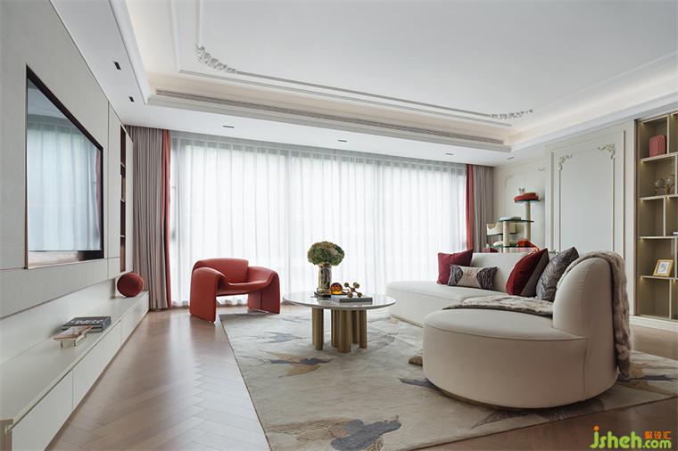 125㎡户型实体样板间,整体以灰白为基调,样板房设计经典的朱红与灰白碰撞,形成大胆强烈的色彩对比,展现出一种简约精致的生活态度。设计师灵活借助材质、光影、线条,营造时尚优雅的空间感受。