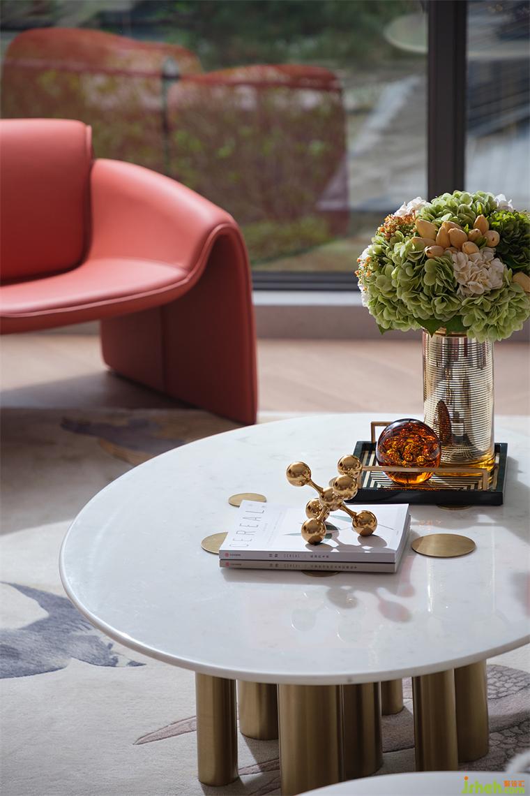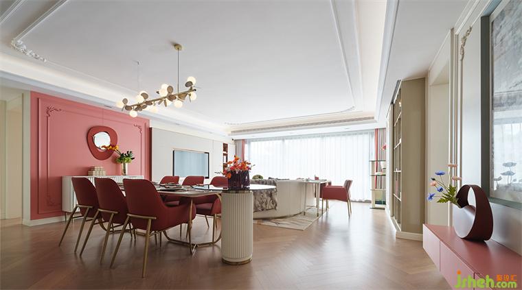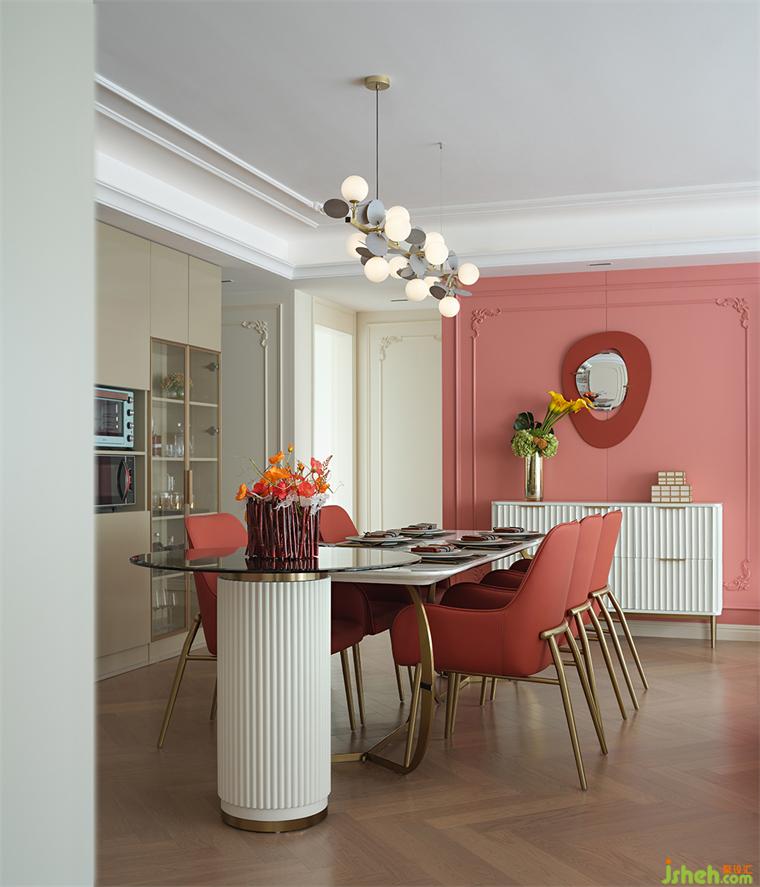 粉色背景墙自然地将餐厅从客厅中划分出来,融入温馨浪漫的情调。样板房设计金属大理石餐桌搭配朱红色皮质餐椅,丰盈了空间的层次感。艺术吊灯与花艺上下呼应,让人感受到三餐四季里的安然与诗意。