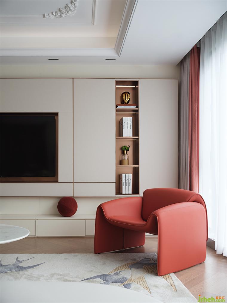 客厅是家庭互动核心区,承载着休憩、娱乐、会客等多重功能。灰白空间搭配原木地板,朱红色沙发椅、抱枕点缀其间,简约高级而又充满艺术气息。瞰景阳台通透明净,安坐家中即可尽揽室外山水。