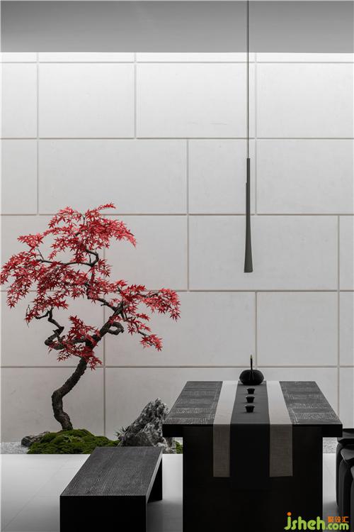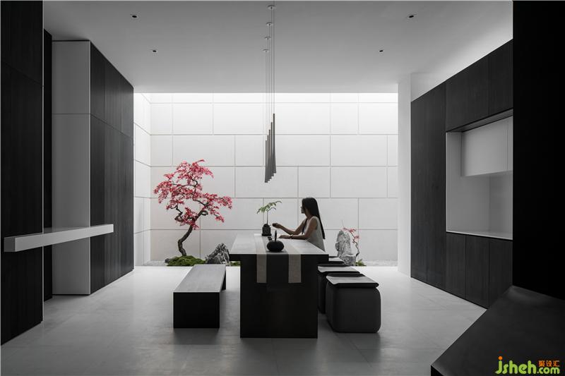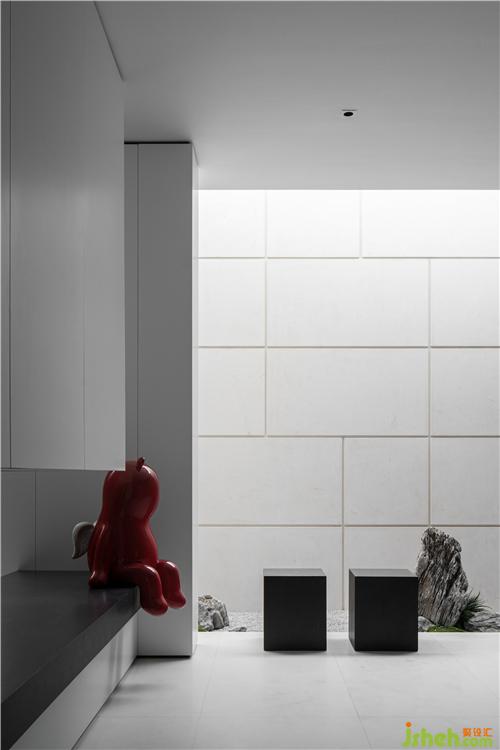 西侧的天窗洒下来一束自然光源,地面结合天花做了,内景观枯山水,把自然光景观引入室内,拉近了空间与自然的关系。在这里,光线散落于空间中,包裹出一个敏感的空间,一种微小、独特的分子随着光线散落在空间之中,房屋的情绪被细致地调动起来。