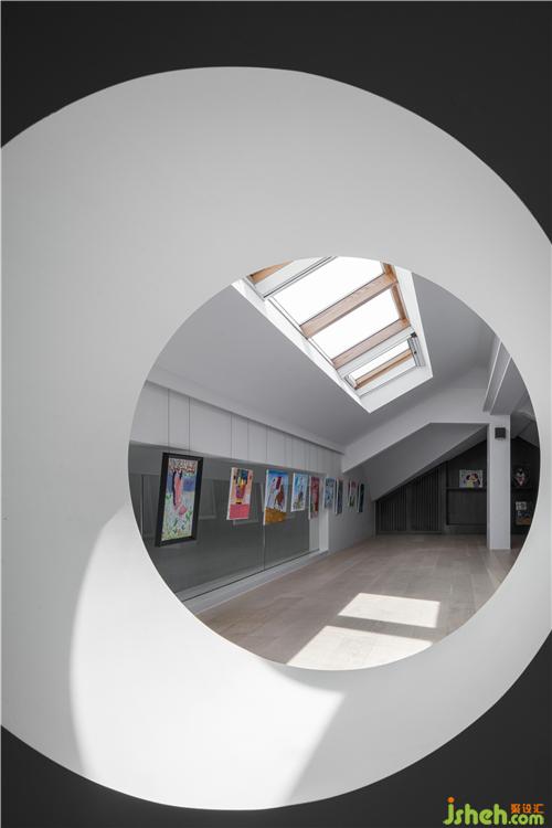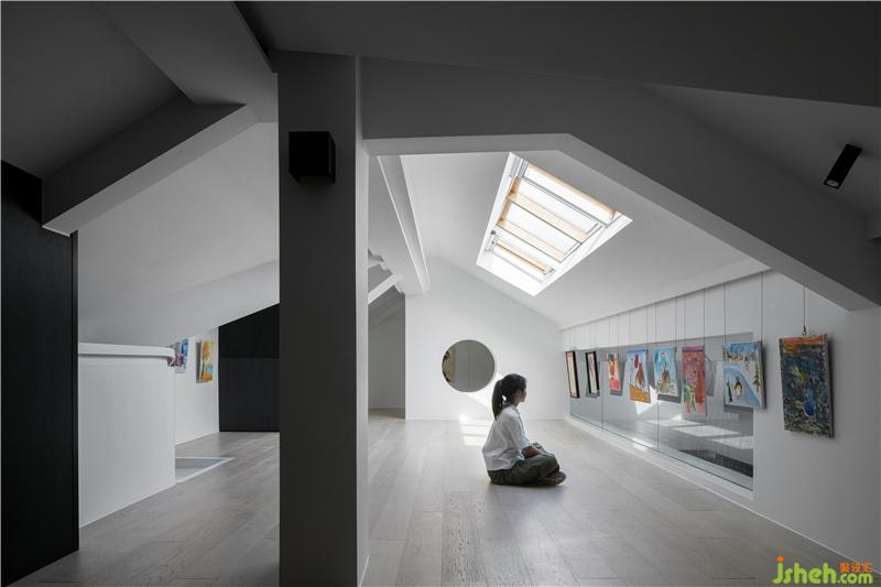 这对幸福美满的年轻小夫妻,孕育了两个小孩,一个爱绘画一个爱音乐。阁楼空间作为“星空艺术画廊”处理,展示了小朋友近几年的绘画作品。