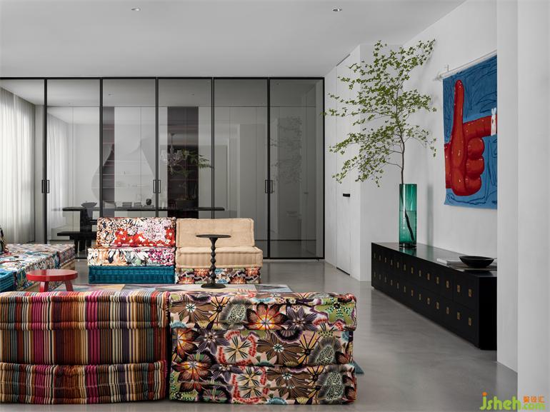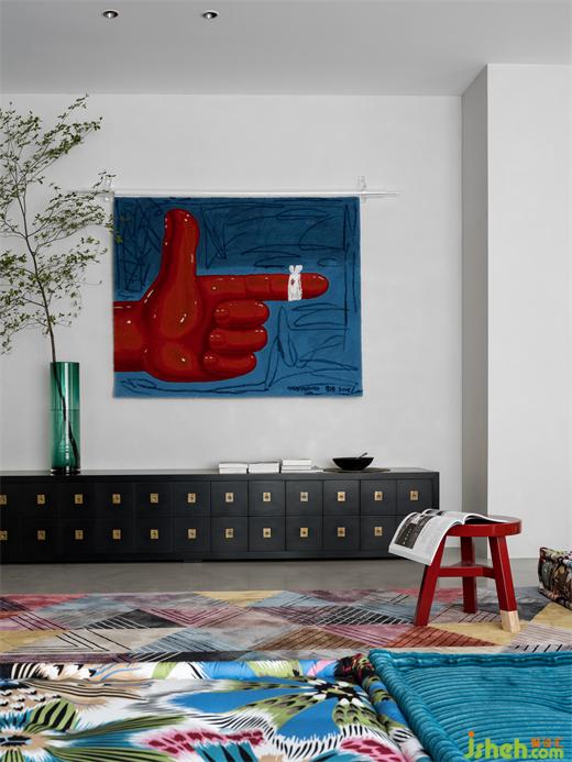高饱和度的几何图形挂画,墨绿色的沙发,红色的可爱兔子座椅,莫兰蒂色地毯,别墅装饰使静态的极简之家充满灵动的艺术时尚感。