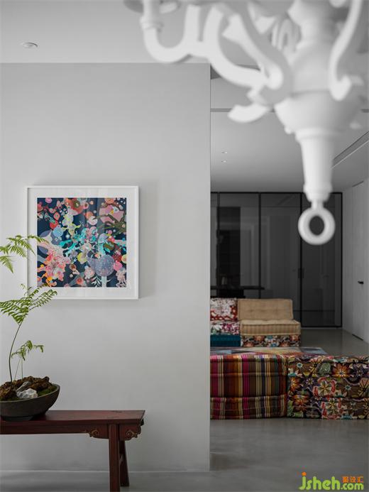 边柜的造型是老式中药铺的草药柜模样,只一眼便仿佛闻到了中草药的独特气味。其上也装饰着同系列的复古感陶瓷容器。别墅装饰墙上的高对比度的蓝红色明丽画作充满的抽象的西方现代时尚之感,而充满中式乡村复古氛围的红色的木头小圆凳与画完美呼应,不同的文化元素相撞却产生了极度和谐的效果。