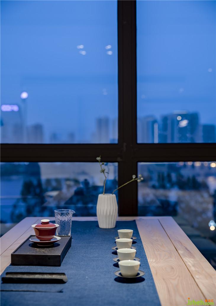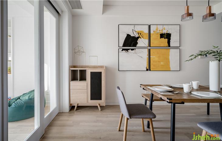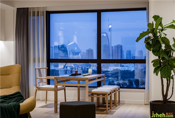 客厅一侧,整面的落地玻璃窗,引入室外明亮的自然光线,让空间更加通透开阔。而原有的阳台位置,则打造成了品茗区,是居者追逐静心的绝佳场所。客厅和餐厅采用了开放式布局,延伸的木地板和白色墙面将两个功能区连为一体。