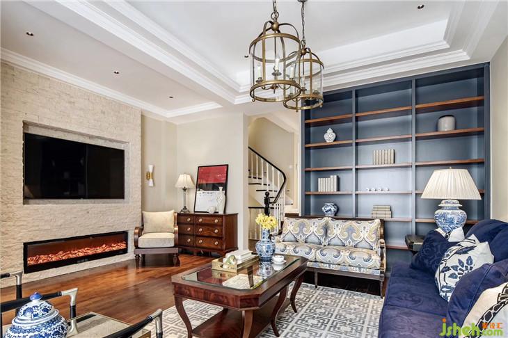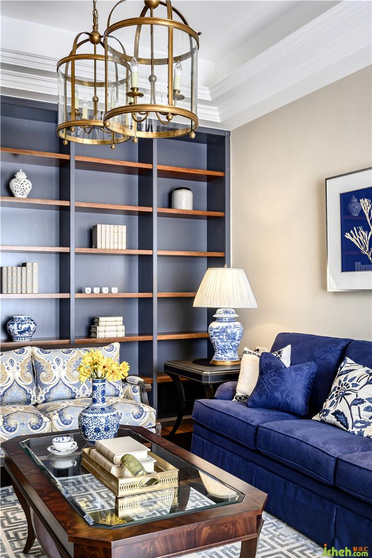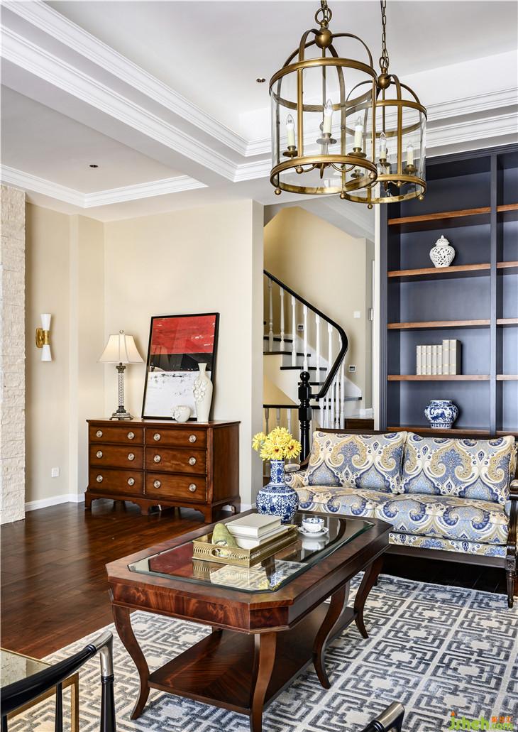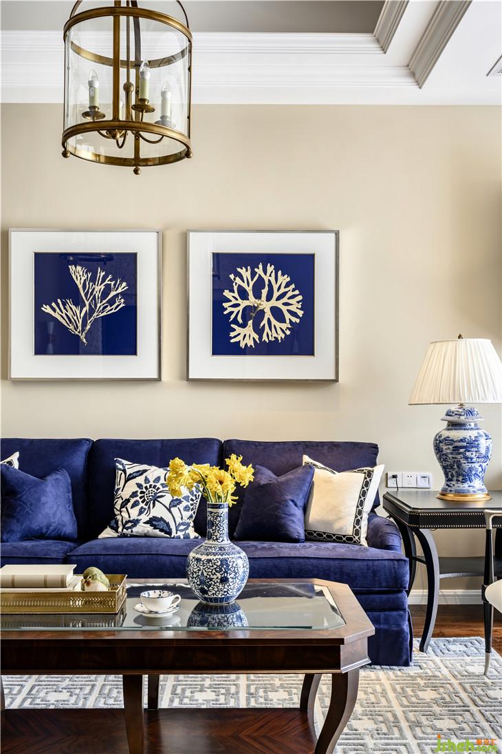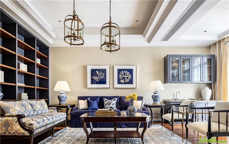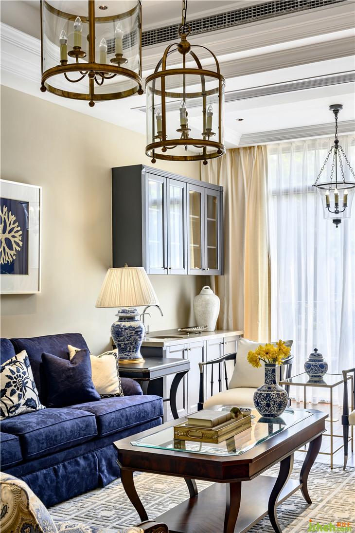 色彩上,宁静且富有质感的灰蓝占据C位,搭配美式家具、复古造型的吊灯,将空间内敛而深刻的美式奢华与优雅情调延展开来。