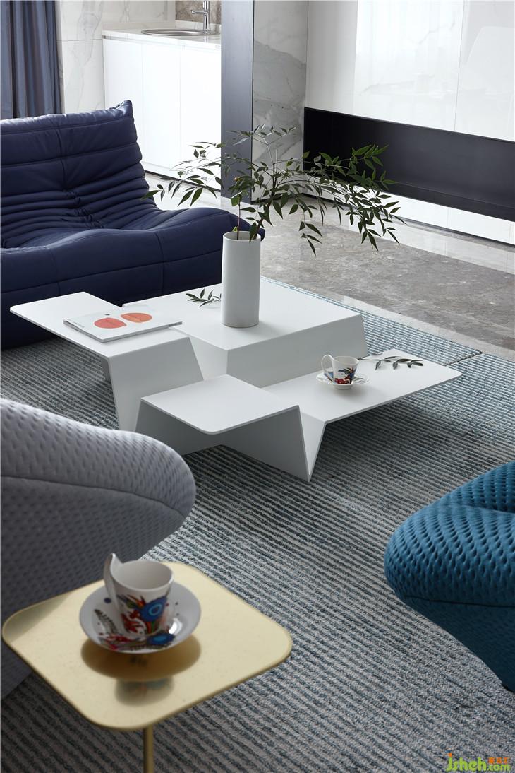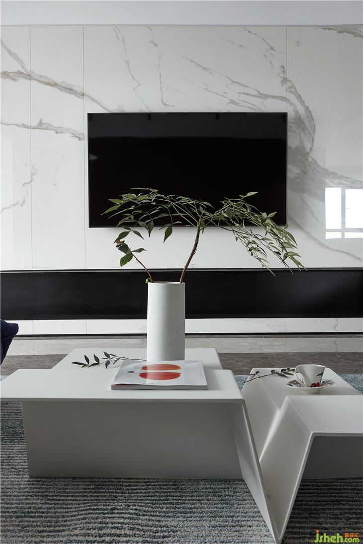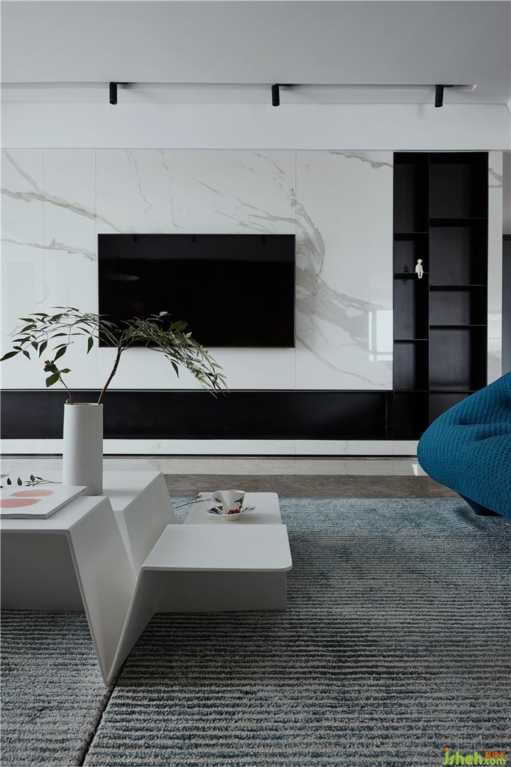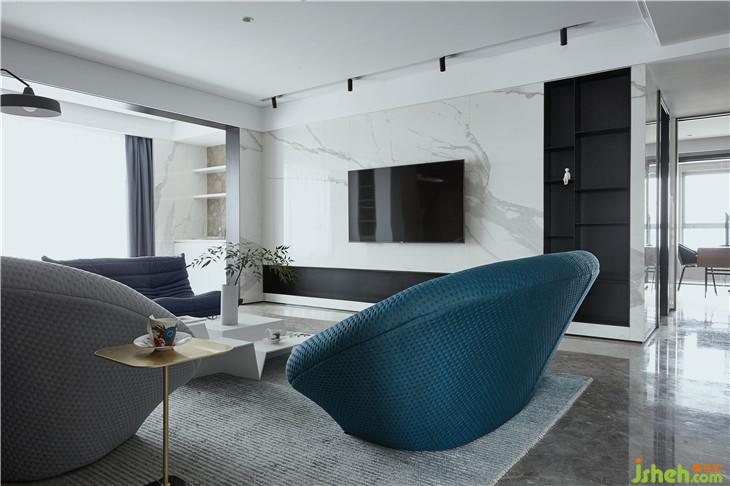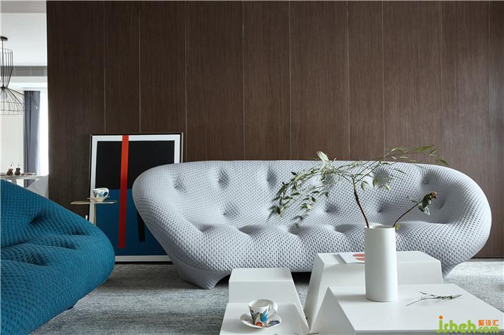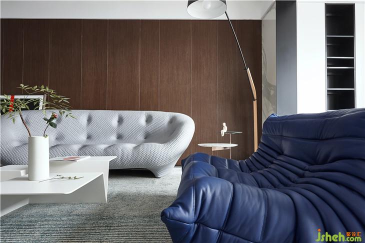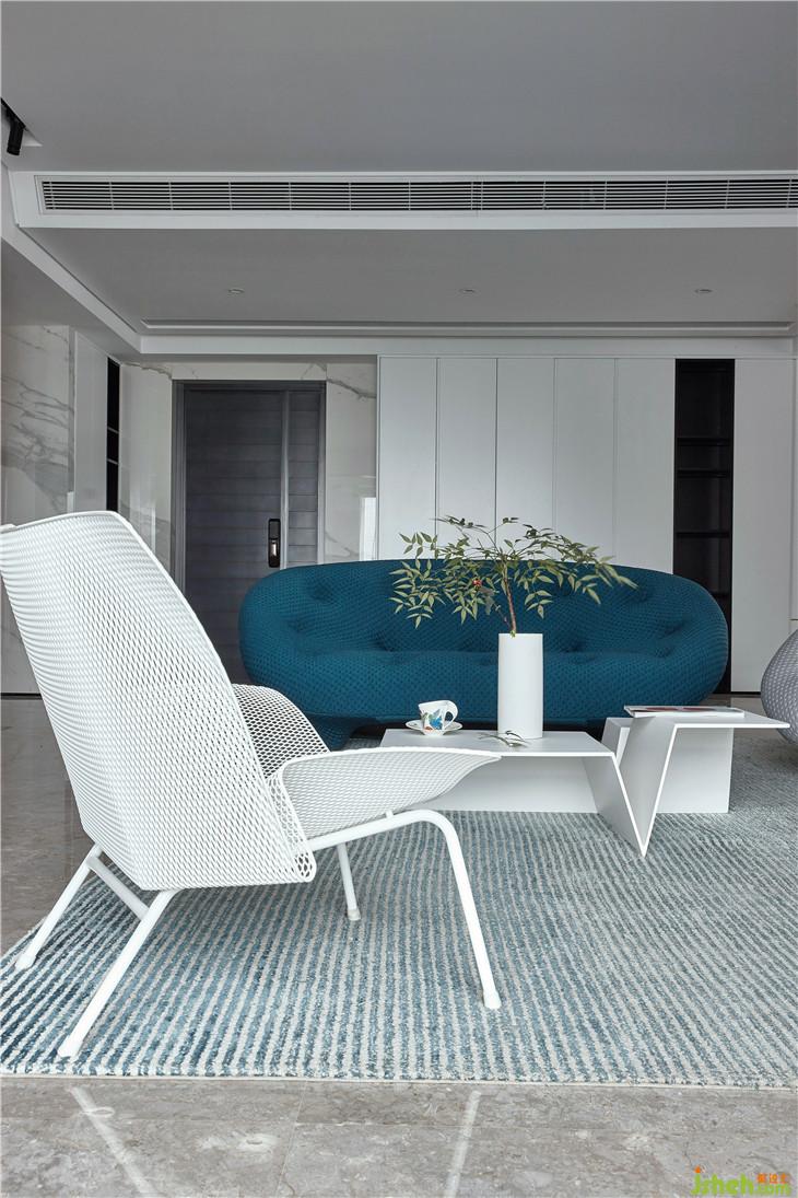 在客厅,宁静深灰蓝与低雅灰的组合就像是静谧的海面上,薄雾袅袅,诗意无限。而亮白色的加入,仿若一线天际之间天光乍破,于平静之中内敛着无限生机与力量。