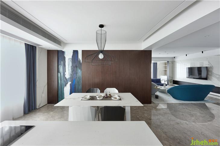 餐厅延续客厅时尚轻奢的基调,在色彩上,大面积的白,更加放大了深灰蓝的宁静气质,让空间如洁白的云朵般轻盈,以足够的包容去承载居者生活中的众多美妙时刻。