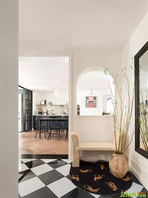 于是从对于光与空间的感受入手,广州复式设计通过空间连通尝试让玄关变得通透,左侧墙体做成玻璃窗格采光,加上正面的墙洞形成了前框后景的设计。相信流通的空气与光线足够活跃心情,装修设计将进入者在空间高度方面的注意力转移到四周,建立视觉引导。另外在玄关左侧窗格也设计了隐藏的鞋柜,成为兼顾美感与实用的一个空间。