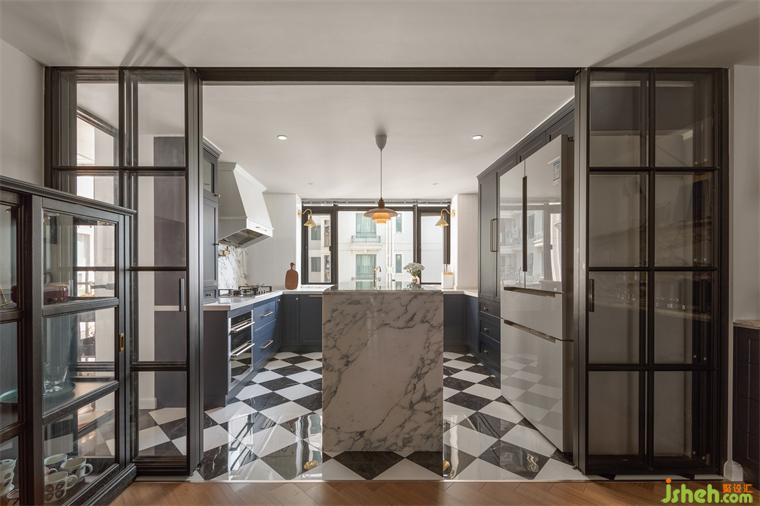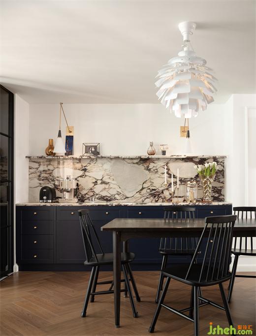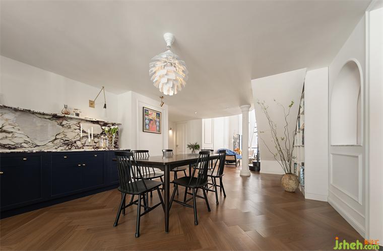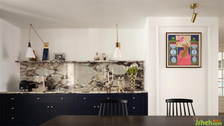 餐边柜使用的大理石是业主挑选了许久、专门从外省运回的宝格丽紫,广州复式设计中间酷似爱心的天然纹理表达了主人的浪漫。他们喜欢把心意隐藏在这房子的某个地方,又与整个设计配合的丝丝入扣,让人赞叹。