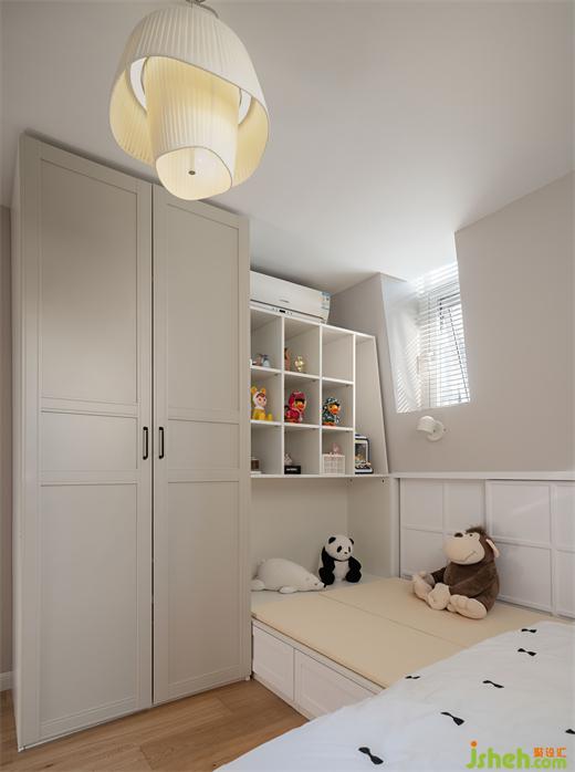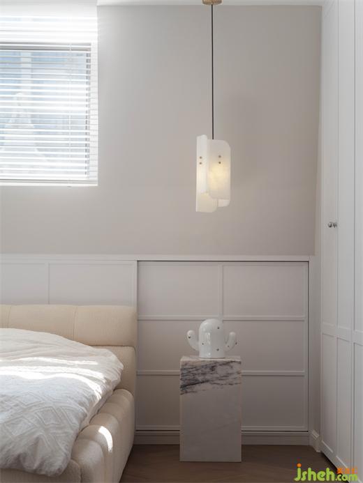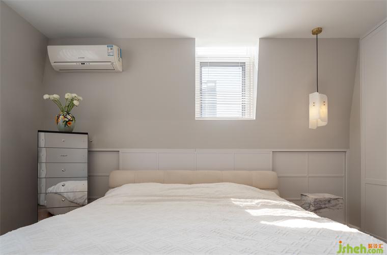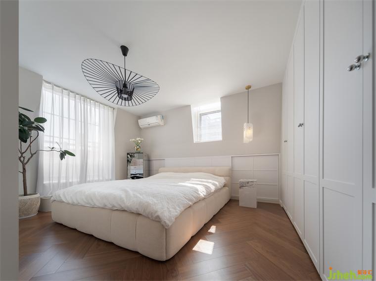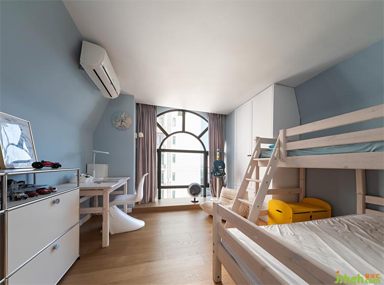 主卧通过仪式感十足的双开门,进入房尺度恰好的主卧空间,哥特式的顶窗,形成天然的船头背景,搭配上卷叶吊灯,毛绒床的质感,让进去的人第一感受就是无比的放松。门后是连排的隐藏式衣帽间,步入式设计,让它与衣柜融为一体。