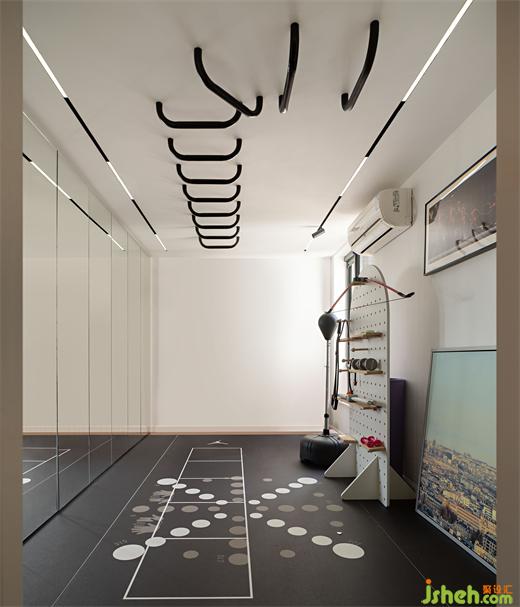 一楼的功能房同时也用作健身区域,牢牢焊接的攀爬架、连排的平面镜柜、订做的健身专用地板胶、自定义器材架等等,展示了多姿多彩的活动可能。