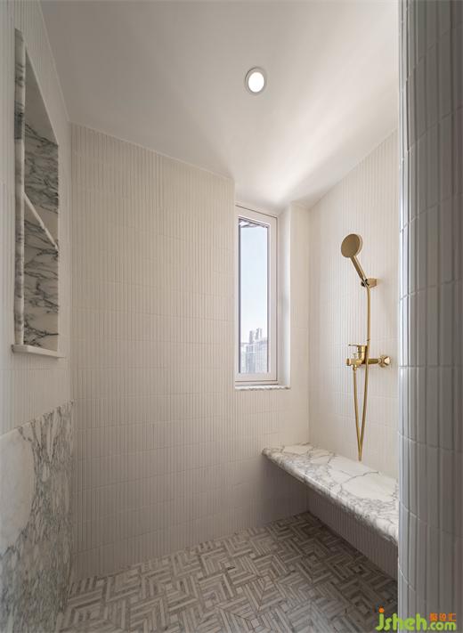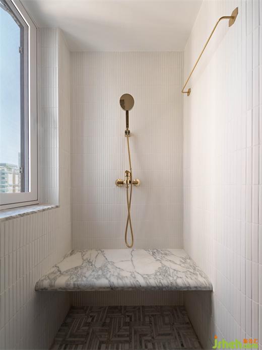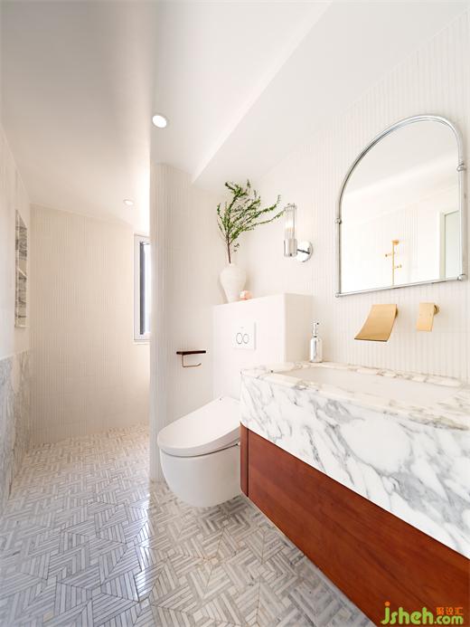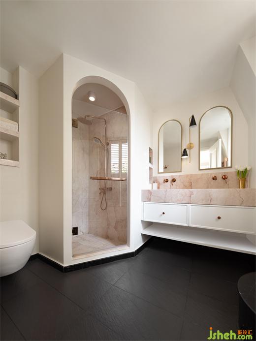 一楼的卫生间采用了很多的弧形设计,使用了很多的大理石马赛克元素,洁白的空间,广州复式设计在图案上花费了很多心血,像一朵朵“雪花”洒在整个空间。第一次进去的时候,都不让人觉得它是一个洗手间,更像是一件艺术品。