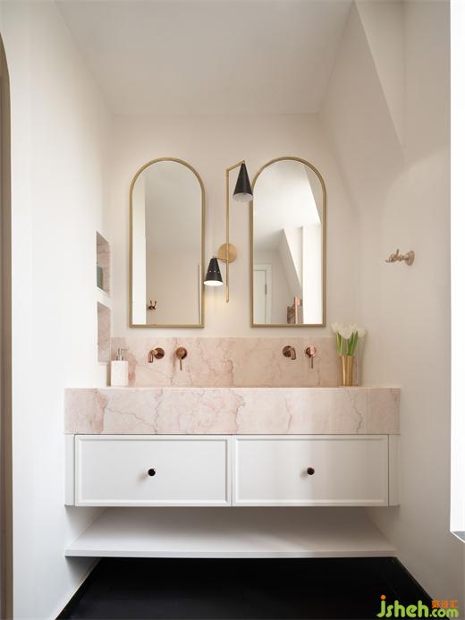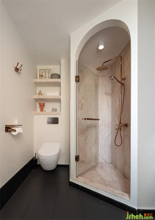主卧卫生间的设计,使用了大块的法兰西玫瑰大理石,再搭配质感十足的玫瑰金花洒龙头、双面的金属镜,装修设计显得相得益彰。为了解决水池的收纳空间不足的问题,我们在它的侧面做了一个几乎隐藏的壁龛。