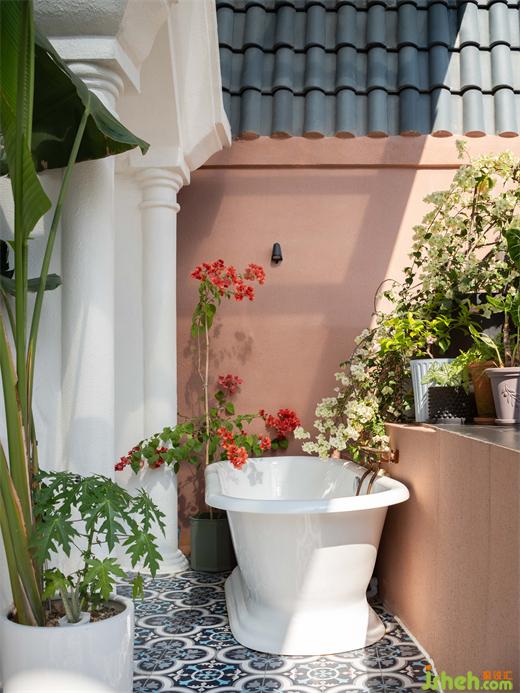 把浴缸置于主卧卫生间外的阳台上,会是一个热烈而又浪漫的构思,装修设计阳台围栏上种植了大片的植物,既起到保持私密的效果,也烘托了泡浴时的氛围,可以想象在寒冬夜里在户外花园中来一个泡澡是何等美妙。