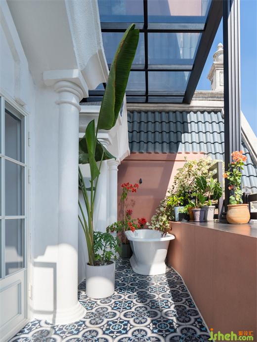 广州复式设计艺术的肌理漆配上穹顶造型,进入阳台是一件多么充满惊喜的体验。花纹版的地砖,也是为了搭配植物所做的“陪衬”。