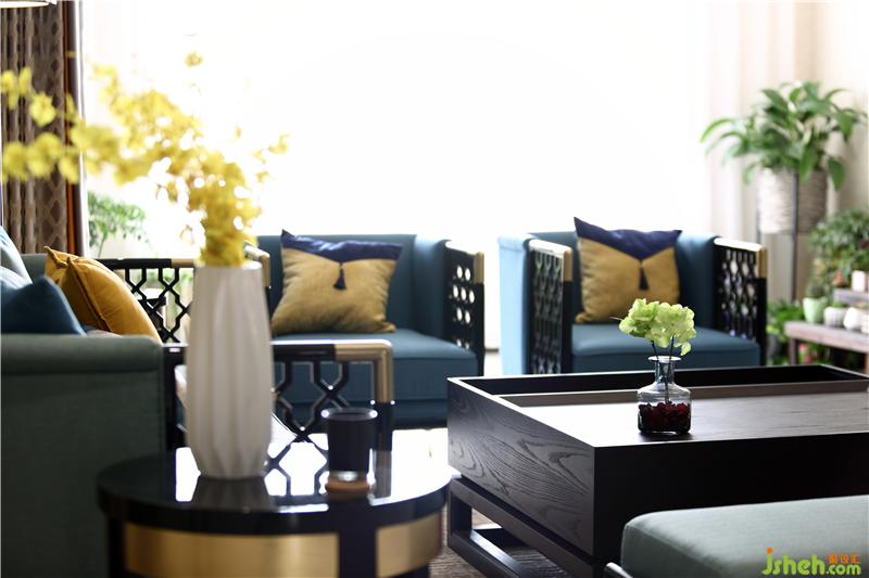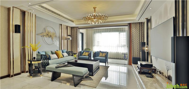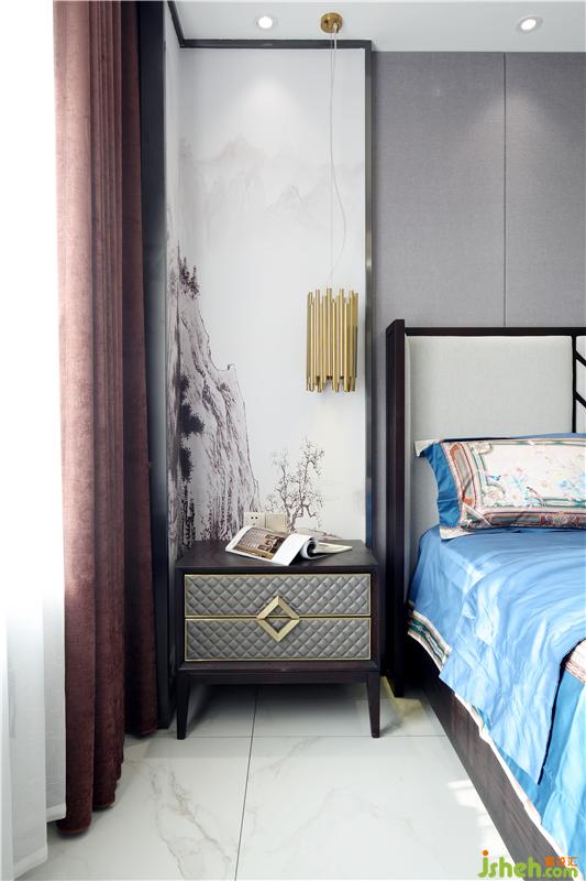 客厅是交友娱乐中心,影视墙采用墙面暗藏灯带,中间墙采用高级山水壁纸饰面,既大方又有气派,客厅的沙发背景墙采用金属线条围框装饰,自然暗香的木纹,高贵的香槟金挂饰,清雅高贵的灰蓝,在这里感受一茶一世界,一壶一人生东方优雅生活的细腻。中式与现代轻奢结合,留给我们更多的是意犹未尽的东方韵味。室内设计师