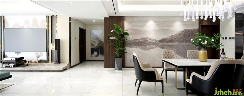客厅与餐厅相邻无隔断,自然光自景观阳台落地窗倾泻而至,为居室镀上一层暖色光晕,落下满室温馨,岁月静好。餐厅背景则为一副墨色的山水画,在温馨灯光衬托下,打造出一副朦胧美的意境。山水融为一体,在含蓄节制的空间中感受自然的韵律,将自然大美引入生活,寻找生活的本质,营造一种中国式的优雅奢华空间。室内设计师