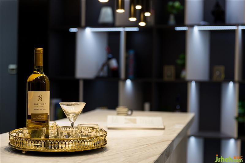 餐厅的整体色调基本与客厅协调统一,背景墙区域同样是采用大面积的白色,亮点之处则是以温暖的壁炉作为视觉中心,木质的餐边柜与大理石质感的餐桌相互协调,线条流畅简单,空间色彩上更为活泼、生动。餐边柜的区域设计的吧台,便于男女主人平日里小酌,也更多了些慵懒放松感,暖光直接投射于餐桌的金属餐具之上,体现出一种精致高贵的生活环境。室内设计师