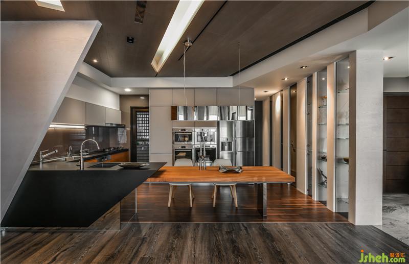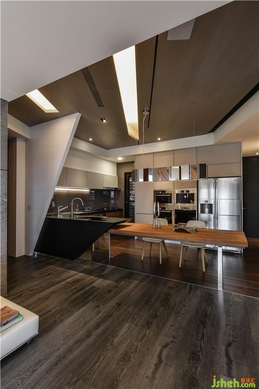 悬浮的餐桌量体,以精密的计算镶嵌于造型吧台中,让餐橱空间成为一系列流动线条的延续,放大了整体的空间感;配色、材质与造型的相互搭配,结合了展示、收纳、起居与创造性的空间关系,亦为屋内迎来了各种超现实色彩的重力感受。藉由曲度、折线、面材对比,打造出具有流动感与故事性的居家空间。