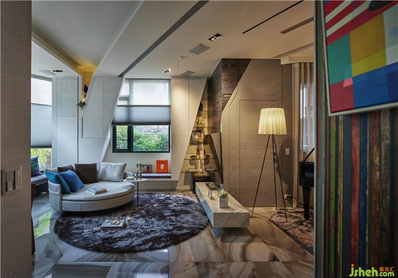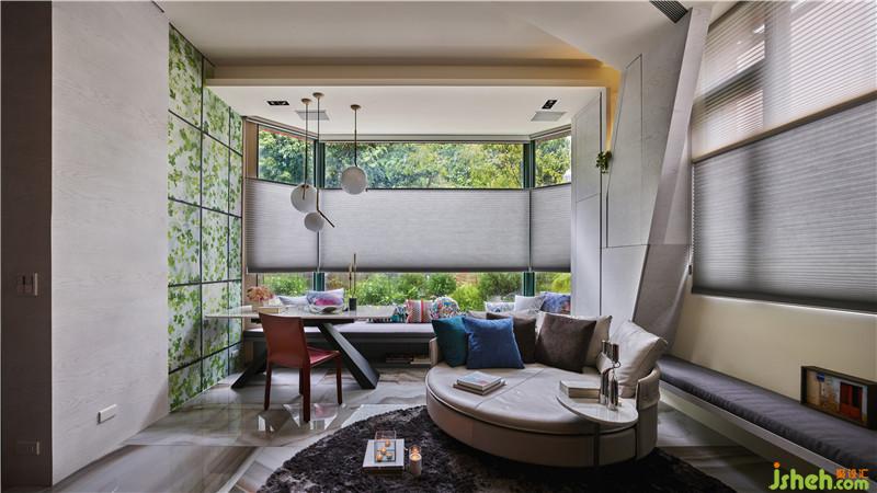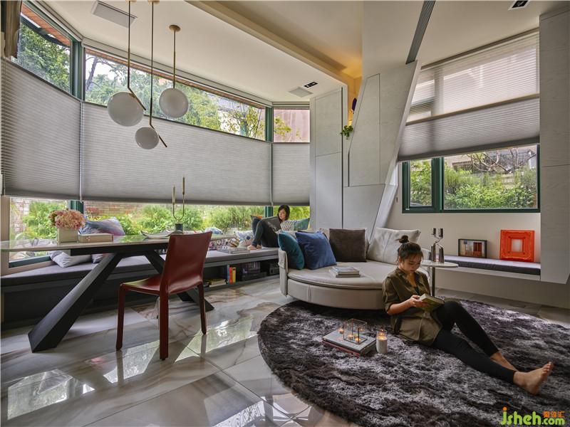 在小坪数的空间置入钢琴,将它视为公共空间的主体,作为串连客餐厅与厨房的角色,进而达到场域的开放流动性;针对客厅部分,打破旧有常规,以弹性的座椅模式呈现,与窗外造景互相对话,引景入内,让绿意在室内游走;将餐桌移至窗边,形塑一种在田园用餐的惬意氛围,也围塑出客餐厅的共享感,藉此加大活动范围的错觉。天花板的延续及灯光配置看似只是造型的一环,但整个空间其实有着强大的收纳功能,将兴趣与生活做完美连结。