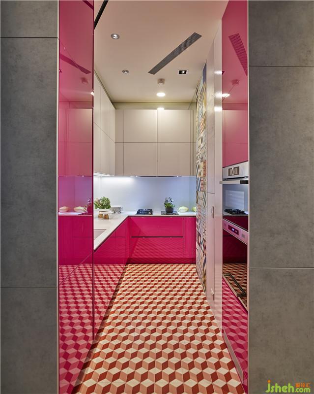 色彩搭配上以大地绿色调作为基底,再层层堆栈丰富色彩,创造独特且具有内涵的空间层次。厨房则选用女人对料理热情的桃红色,颜色饱满,平衡了两侧水泥柜体的原始质感,彷彿是在一片灰色之中拉开缤纷世界的入口般绚烂,十分具有艺术张力。而主卧讲求穿透调性,已大量弧形围壁营造包围意象,用红色的热情灰色的沉稳述说的一抹法式复古怀旧感,色彩及造型的深厚底蕴设计,交织出了令人惊艳的小宅佳作。