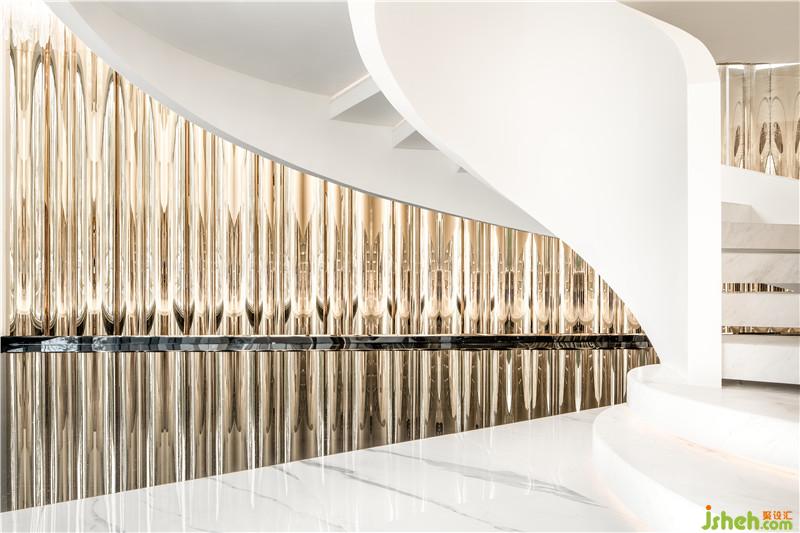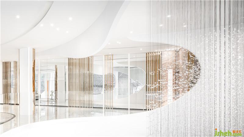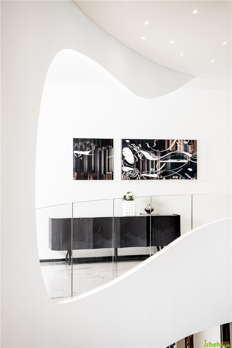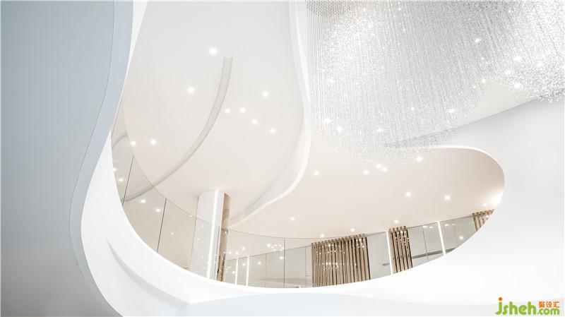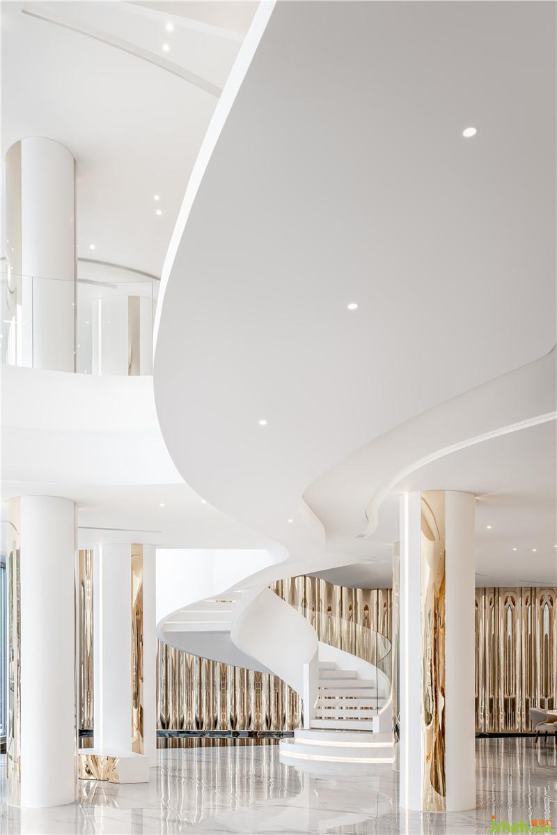 多重灵动的弧线,打破既有城市空间的想象,解构當下風潮。白色空间的无界表達,与旋转而上的圆弧阶梯,制造出一种云上漫步的错觉,将日常平凡的视角移高到云巅。大师设计的尺度开展叙事的艺术,静谧清水连接室内和户外,展开光与影的叙事,隱藏镜观世界的另一个平行空间。装修公司