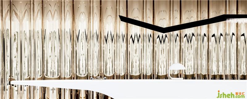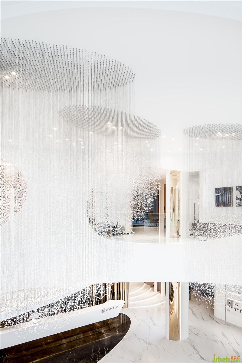 高空缓缓垂下几盏帷幔灯饰,與星空下的呼應,璨若星辰,如璀璨的星光划破时空,定格优雅光影中的世界,与幕墙的金属的光泽透露东方美学智慧。如水自由、如云悠然,向往亦真似幻地成为空间的隐喻,开启美好生活哲学的追随。每一个当下,都向往着月与星辰的未来。掬水在手即可见云上流光。