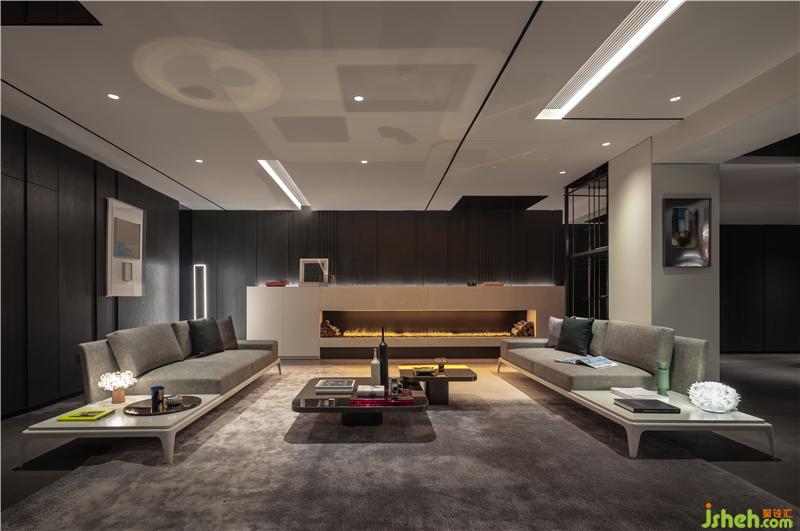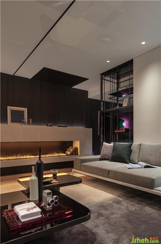 沙发与茶几,配合着光影与色彩的搭配,组合成一幅现代主义的图景,长条矩形的壁炉跳跃着温暖明媚的火焰,让时间变得明媚,幻化成夜空中最亮的星。