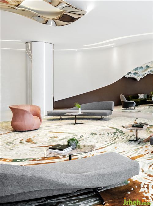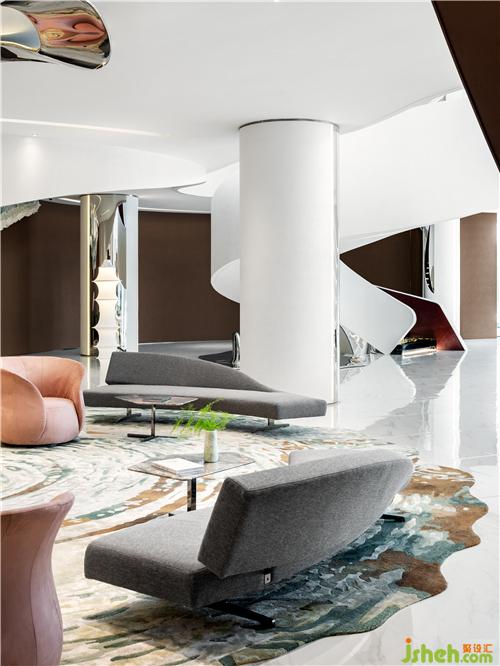 无规则绿纹地毯如池塘微动,在澄净白练的空间变化出水波漾漾的虚空幻境。几只橡皮粉鹿皮绒单人椅,如似开未绽的朵朵粉荷立于水塘之上。布艺灰色长条沙发,如洗练的石块静静匍匐于荷塘水面。一高一矮与空间形成微妙的对话关系,又如一尘未沾的未来世界,梦幻而又充满现实感。