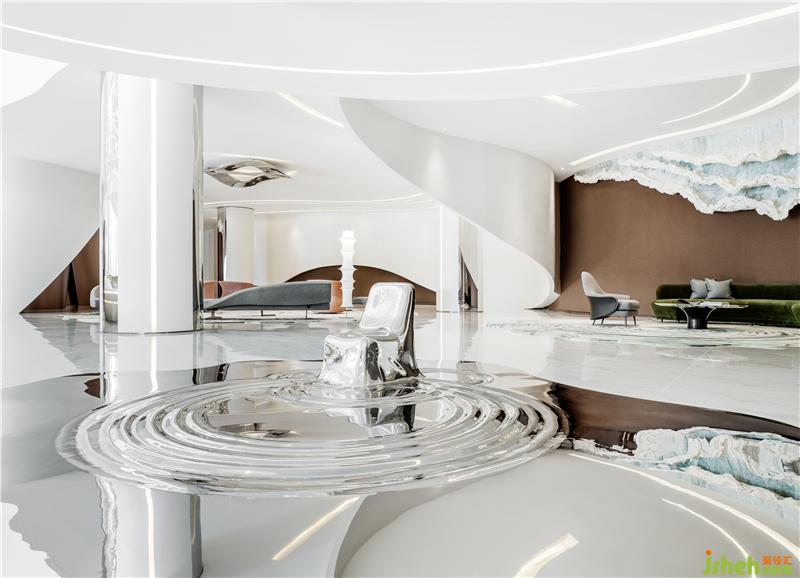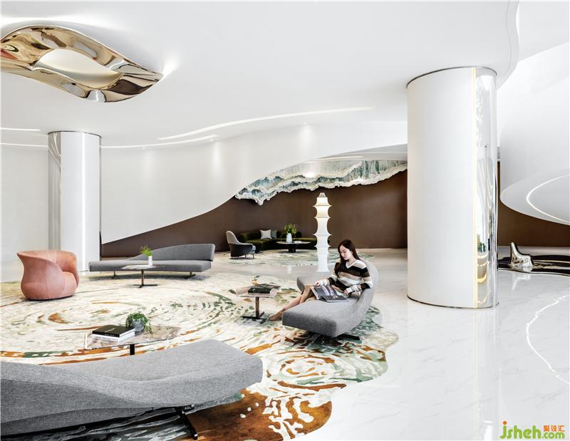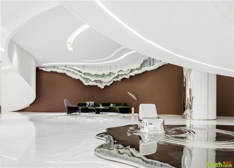 踏入洽谈区,时间静止的魔力扑面而来,以「宇宙:引力、自转、公转」为设计主轴的美学阔值,引出杭州水脉形上的玄想,藉由想象创造一个拥有无限可能的空间。