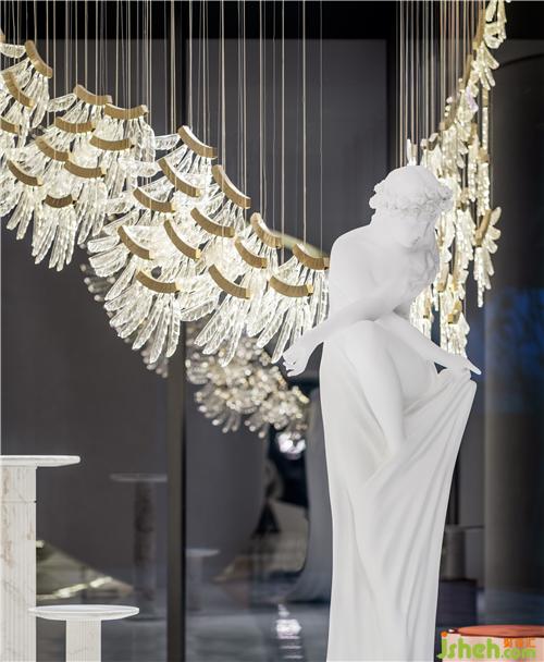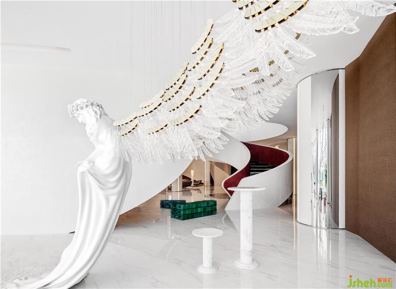 旷远的空间内天使降临,矩阵式灯带自空中垂直而下如天使绽开的双翼,感性的温度柔化理性的空间,为宇宙浩瀚的诗意阐发出无限哲思,让艺术的力量丰盈空间气韵。突破次元的超现实感,一如《三体》文明中地球人梦境与潜意识的画面拼贴,透净且流畅的空间形态,构成超现实的错置感,步入其中内心奇妙却安定。仿佛唯有柔美灵动的力量,方可撼动坚硬的钢筋混泥土。