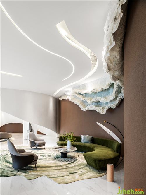 与洽谈一区互为呼应,洽谈二区以绿纹池塘地毯静卧于墙侧,两张单人布艺浅灰圈椅如同两块轻巧的鹅卵石露于水面之上,杭州售楼处设计彰显自然的对生关系。靠墙一侧弧线形苔藓绿天鹅绒长条沙发,如池岸自然生长的苔藓,青葱可爱。潮汐纸扎自顶部倾斜而下向「池塘」潮卷而来,引力相吸,天地起伏,一分一秒都如同来到《星际探索》中里奇幻的星河之旅,只是这里不再是孤独的太阳系旅行,而是充满人文关怀的情感场域。